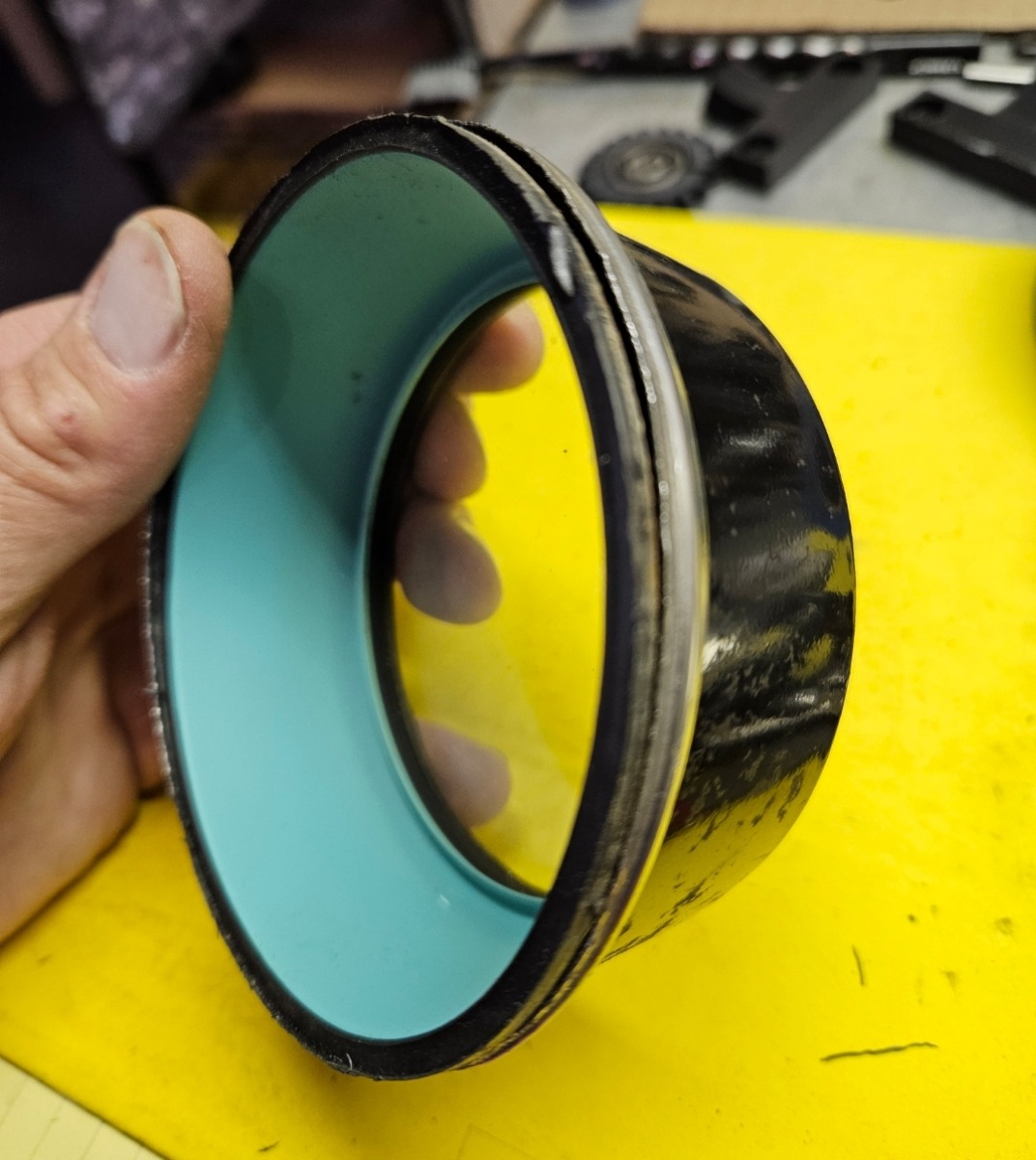 We see here the separated halves. You can see the black gasket still on the front half along with the crimp ring (i had not flattened it out at this point).
