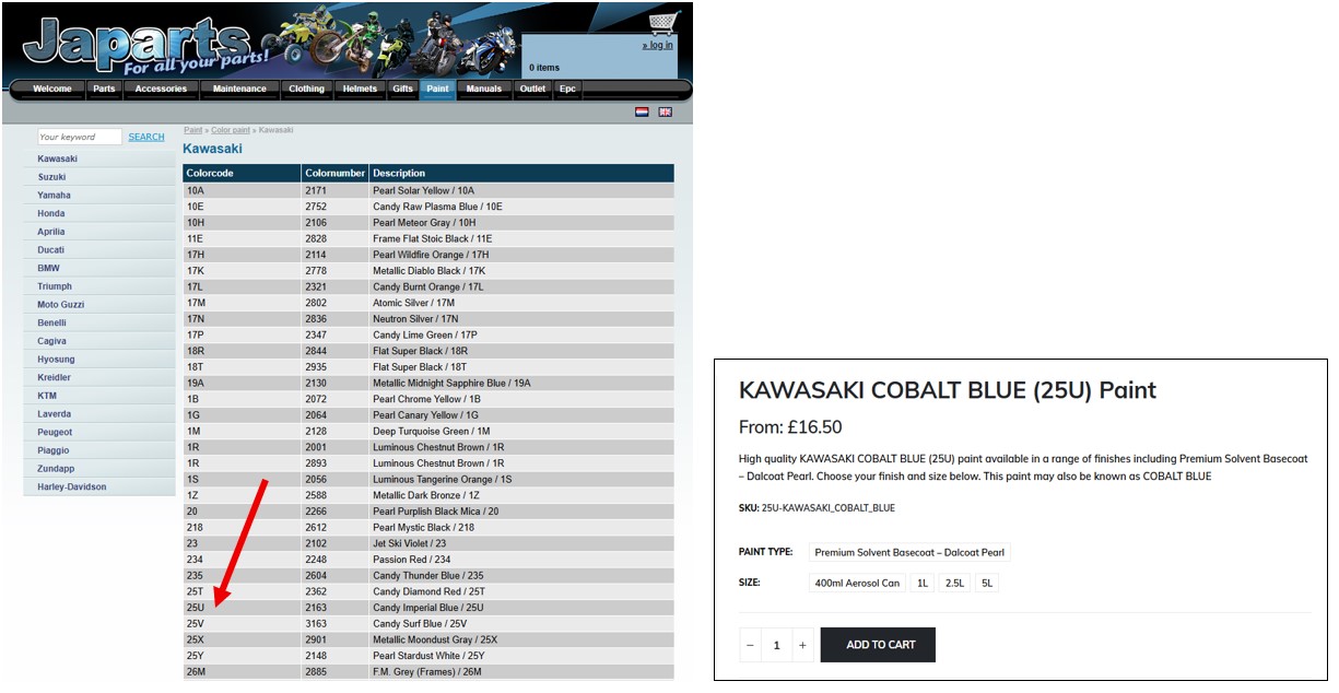 I had a quick look and came up with the below - code appears to be 25U although some disparity with the name of the colour ????