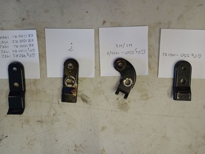 I was sorting some early Kawasaki fairing mounts I have acquired over the years...and I could put them into four categories. See the photo. I have six of these mystery brackets that I can't attribute to any model of Kawasaki . Note the models I can attribute to the other three brackets. The mystery bracket is larger (longer) than the 1981 GPz550 bracket, but shorter than the 1982-84 KZ models. The two mounting holes on the mystery bracket do not line up with the 1981 bracket, but do line up with the 1982-84 KZ bracket. Anyone got a