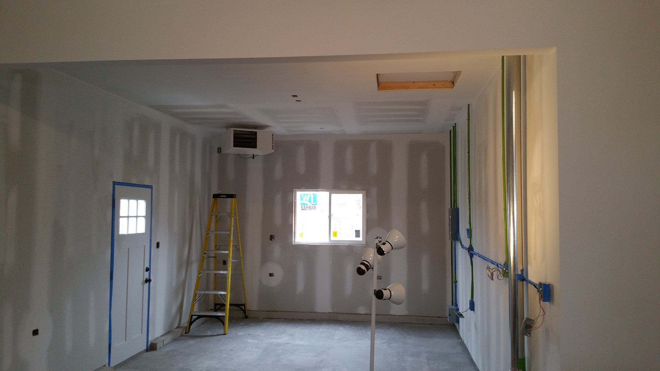 1) While the concrete floor was curing, I had the drywall mounted and taped by union tradesman