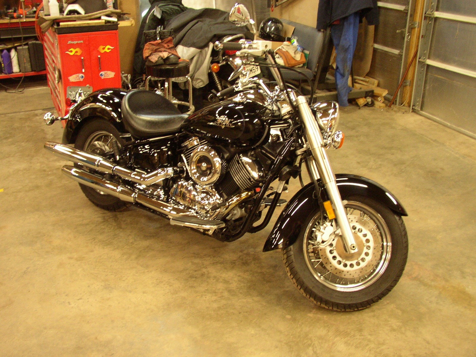 '02 VStar 1100 Classic. Now has a tombstone windshield, Mustang Saddle, MaxxAir kit, punched out mufflers.