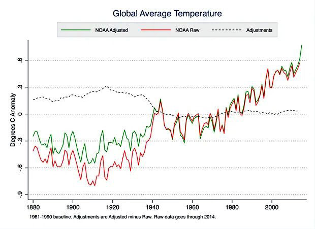 NOAA's US temperature record shows that US was warmest in the 1930's and has generally cooled as CO2 has increased. This wrecks greenhouse gas theory, so they "adjust" the data to make it look like the US is warming.
