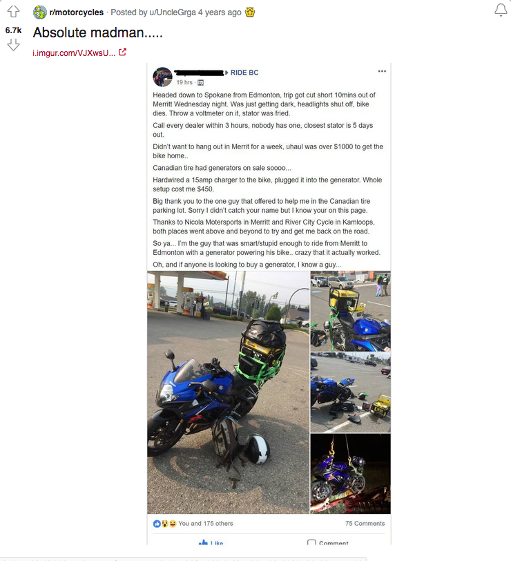25 Sep 2022 22:57 - 25 Sep 2022 23:34Reminds me of a Reddit post where a motorcyclist lost his charging system 9 hours away from home.