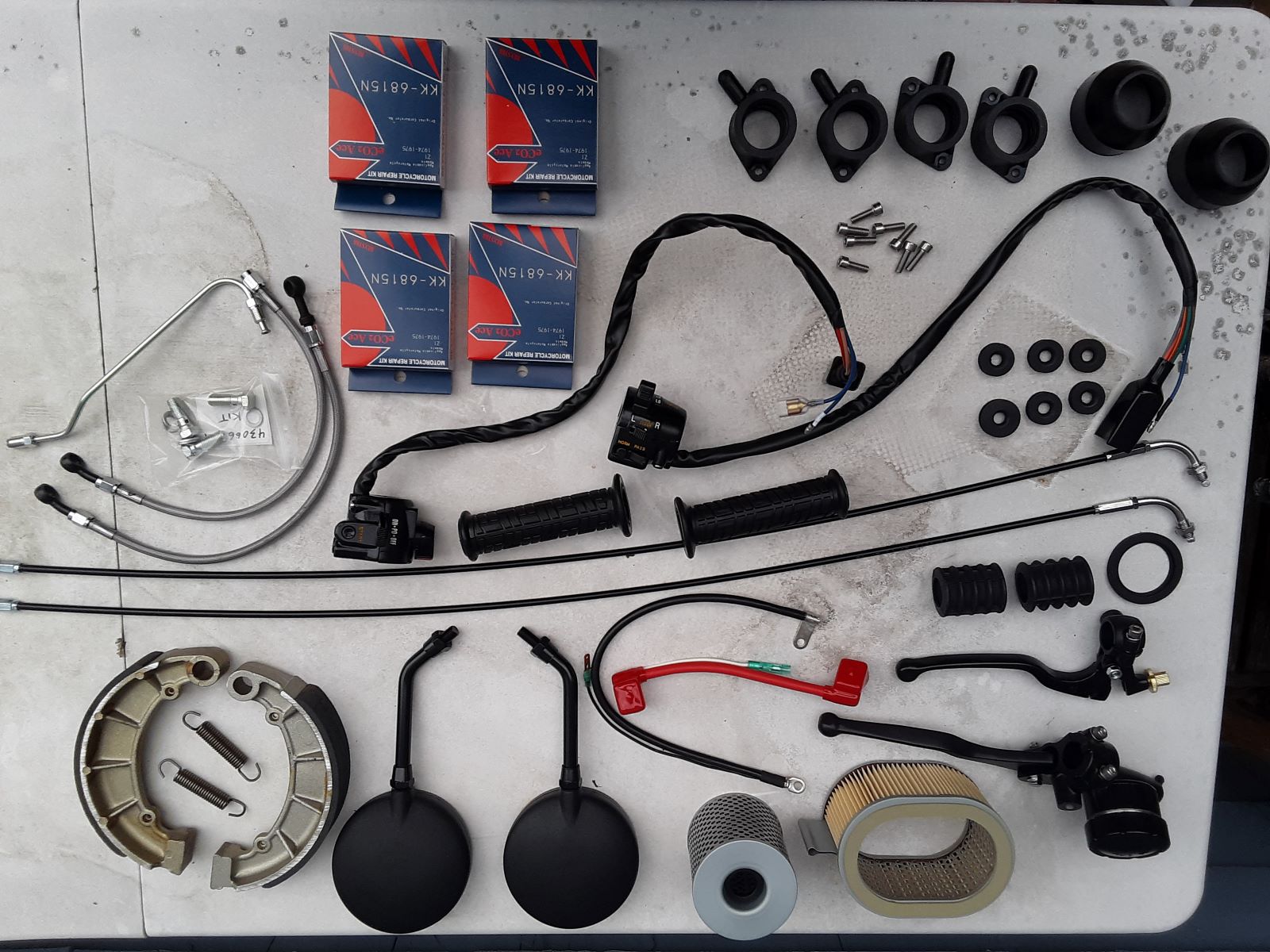 For now it will be general maintenance items: cables, master cyl, braided lines, caliper, rear brake shoes; chain and sprockets; replace seat; replace both fenders with good used ones; rebuild petcock, clean and rebuild carbs (one of the smarter things I've done was to drain the tank and carbs before I put it away). New clutch plates, steels, and springs; new handlebar controls and grips; spark plugs, wires and coils, upgrade to electronic ignition; add "wookie" relay for coils; new oil and filter (now, and again after start up); delkevic 4 into 1; tires and tubes, etc. The only place I'm using the turd polish is on the wheels, tank, side covers and tail piece.