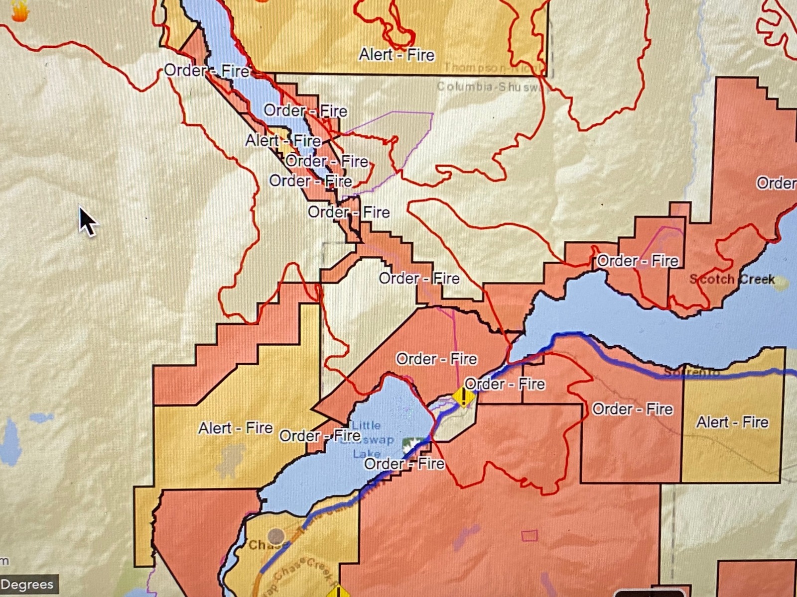 We finally got an update to the fire map last night. They have been fighting two fires for most of the last month. There were some really strong storms about two weeks ago with a lot of rain, but the fires continued to burn. On Friday the winds changed from South to Northwest and were very brisk, with strong gusts pushing the fire to the Southeast, which was directly towards the town of Chase. It travelled 20 km in 12 hrs, expanding in size from 25,000 acres to 100,000 acres. It wiped out four communities, but Chase was saved, likely because there is a lake (Little Shuswap) between us and the fire. We are at the S end of the lake. The fire went through the N end.