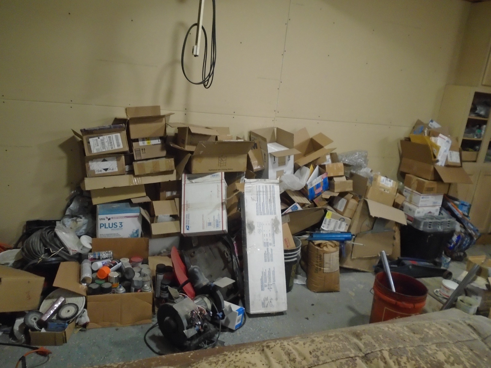 Primary garage where the "stuff happens". Don't have anything dangling from the wall except this ole sign. I see you have a Miller one, gotta go neon with style, Old Style, ha. I do have a spider riddled wall of old shipping boxes though. Great to sort thru when one needs "just the right size".