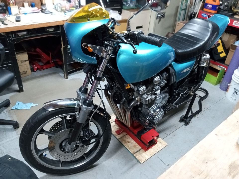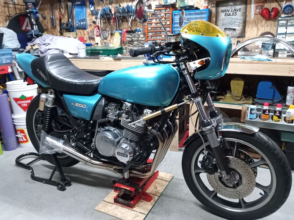 1978 KZ650 C2, 130K kms, Delkevic ex, EI, CVK32, PMC easy clutch, ATK fork brace, steering damper, braced swingarm, ZRX shocks, 18" Z1R front wheel.