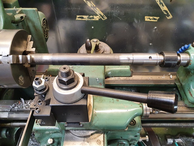 In no time Erik turned down the axle and cut a M16x1.5 thread, forced me to cut the axle with a hacksaw and then finished up the cut surfaces.