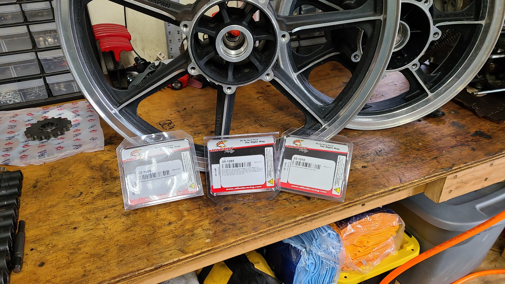 I have all the parts back from my powder coater and vapor blaster so I can start reassembling the bike and really determine what look I am going for. I had both frames done - the textured coated one is the LTD I originally purchased. The gloss coated one is the CSR I purchased as a parts bike. I'm definitely going to use the textured LTD frame and swing arm. All new All Balls Racing bearings for the bike. The wheels are at a shop getting fresh tires mounted as I type. Next step is to rebuild one set of forks and assemble a rolling chassis.