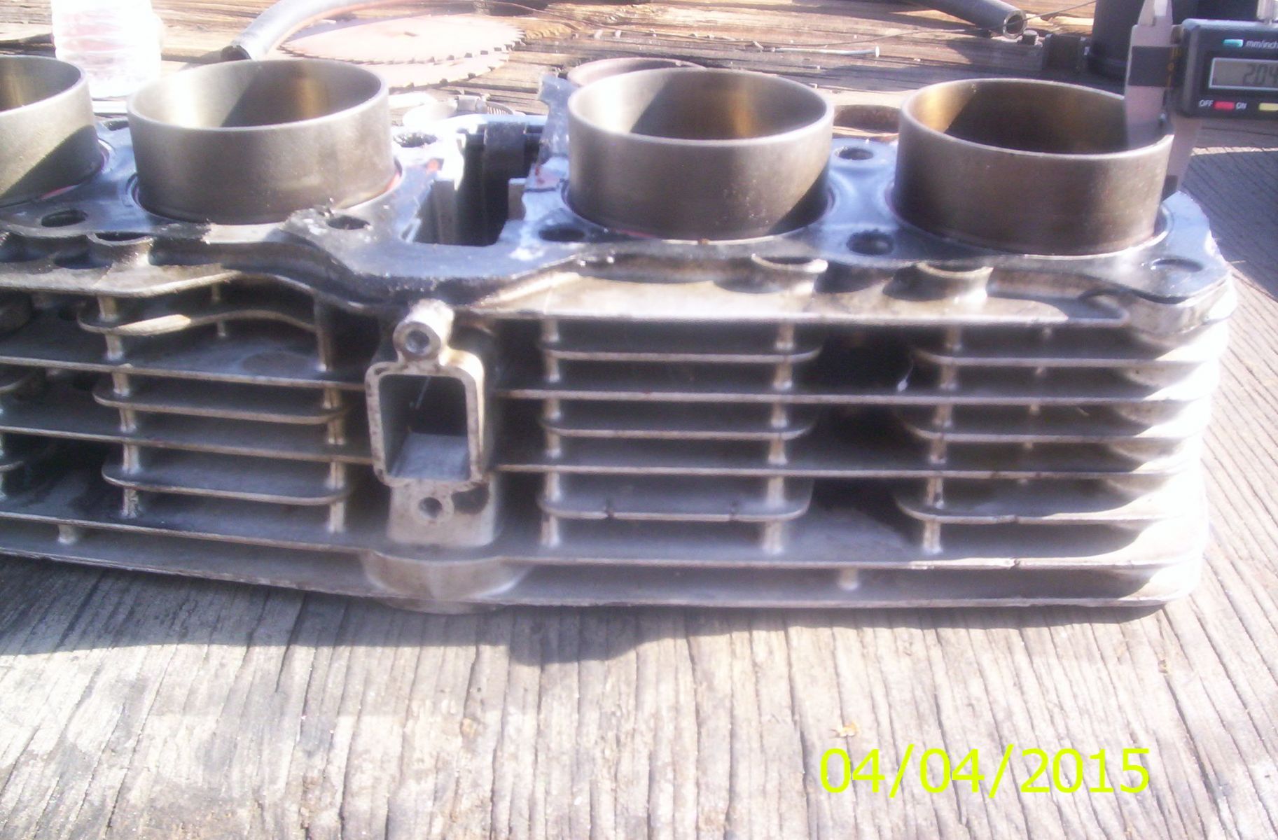The sleeves were out of the 750 motor. The bore was still good when I replaced the cast pistons. They were damaged when I lunched the one piston. Notice there is no groove at the bottom of the sleeve as there would be if they were bored out 900 sleeves. Not much but it would still be there.