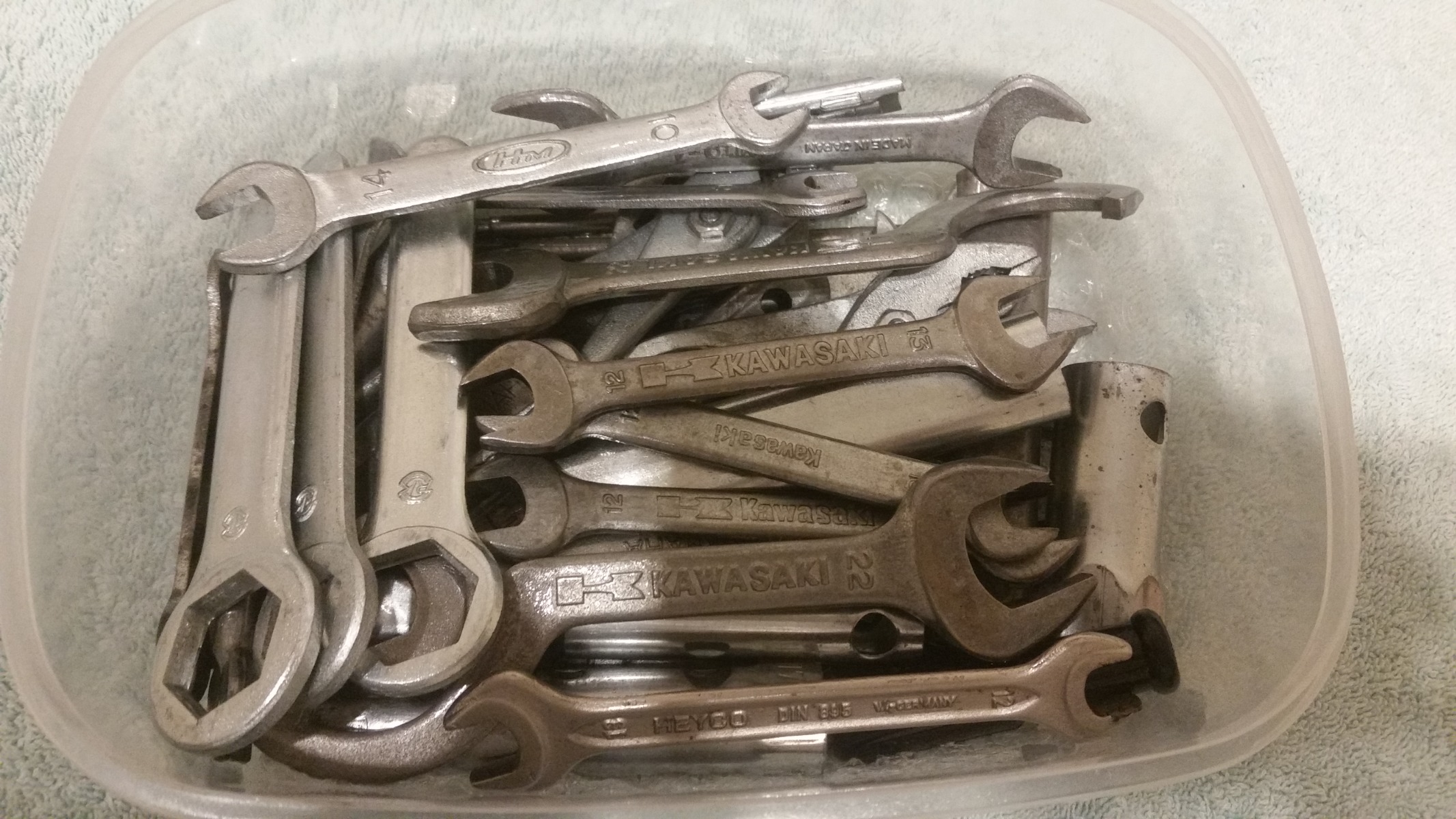 Hey everyone! Yes I'm at it again, messing with old tools! Basically I've gathered all my old bike tool kit tools and given them the Evapo-rust treatment! ,while I was washing and drying them I noticed that the Mito numbers seem to change even for identical looking wrenches! For example two 22mm C spanners, one is mito 2 and the other mito 3, two 13&12mms one mito 7 and one mito 8, two 14&17 one mito 2 and one mito 4, two 10&12s one mito 2 and one mito 5...