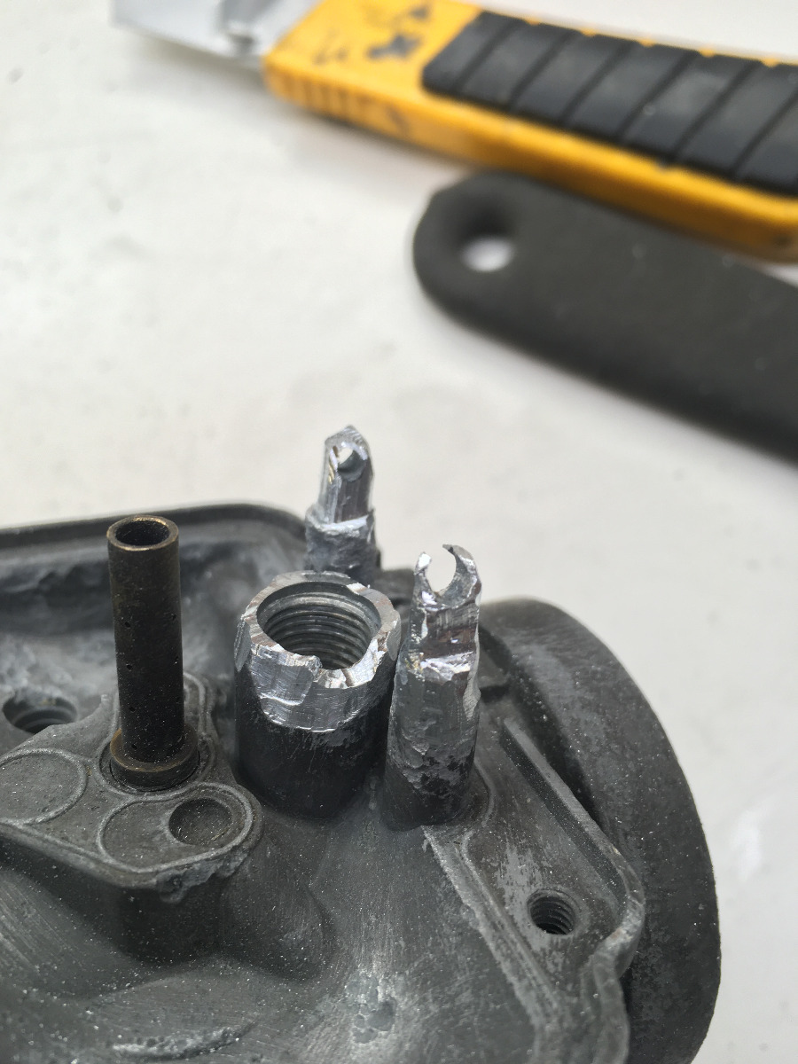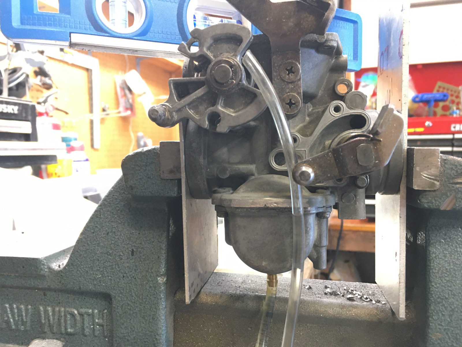 While the carb was still hot from solder I sprayed it with a hose which removed all the flux deposits leaving shiny metal. Then came the process refining it back to something usable. I carefully ground it back using a burr in the Dremel to rough it out and then a series of files to refine the shape. I had to go back with the solder a couple times before i had enough built up. I used the other carb as a reference to mark the tower holes and drill them. I also re-tapped the valve needle hole M10-1.00