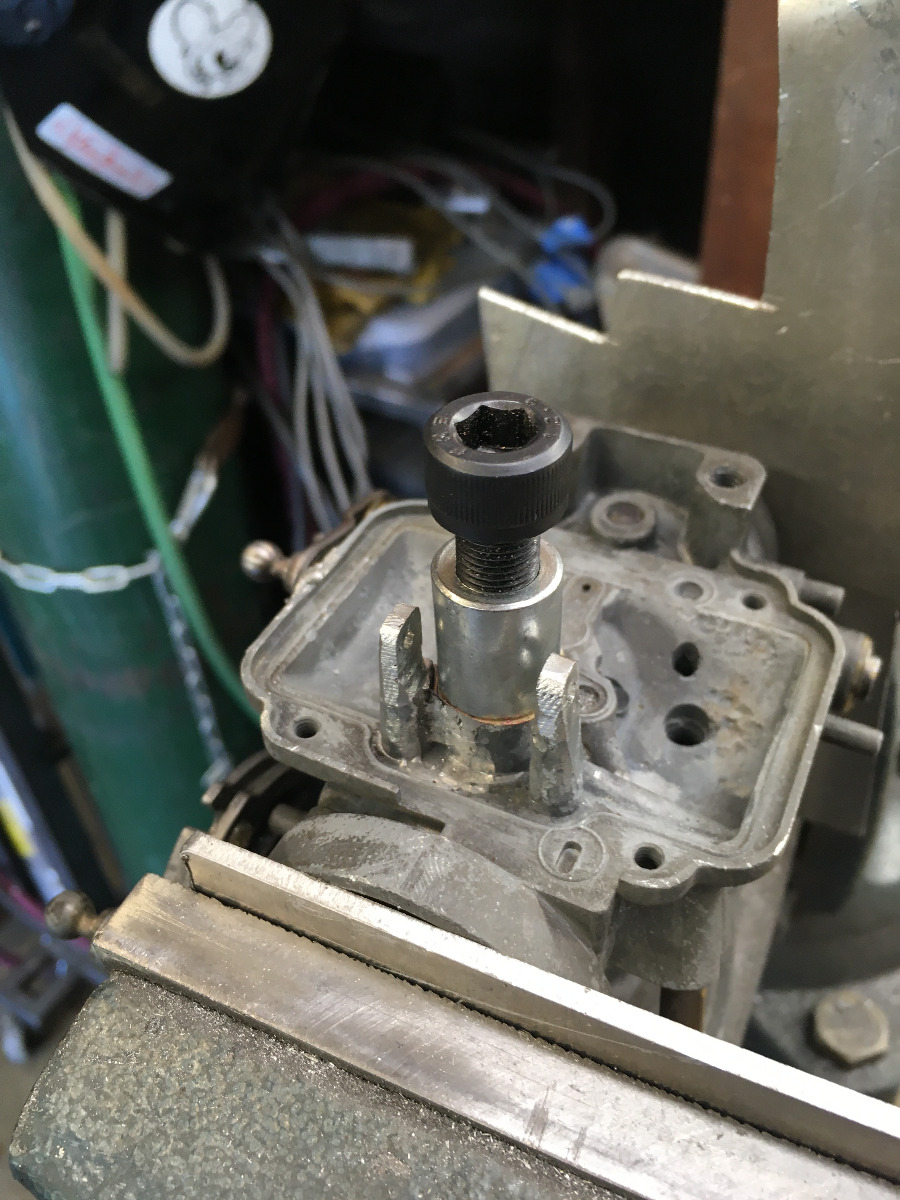 To make sure this carb didn't leak down the road I needed a good seal on the boss. I drilled out a bushing to fit on a m10-1.00 bolt. I then cut a small piece of sandpaper to fit the face of the bushing. Using a Sharpie to blacken the sealing face I then screwed in the bolt and turned the bushing with sandpaper on the boss face. This showed me any high spots which I took down further with a needle file. Once it was relatively uniform i spun the bushing repeatedly until there was no high spots - similar to lapping a valve.