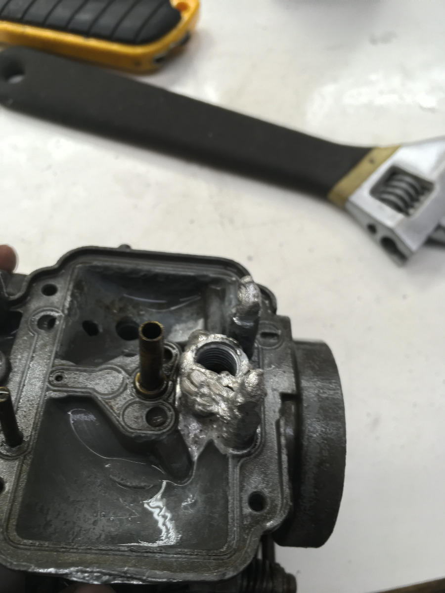 This is where things got a little tricky. I did not have a spare carb to practice on so initially i followed the muggy weld directions. However this was a mistake. The directions i saw were prescribing the solder be used like a solder - using capillary action to wick into seams. This resulted in depositing too much solder as it kept flowing out as i tried to build it up. This was not what i needed as I had to build up material to remove it. Instead of providing widespread indirect heat to allow the solder to flow as per the instructions, i instead focused the heat in localized areas, quickly flashing the area so as not too overheat it. As soon as the flux turns brown you have hit the correct temp. Then with no flame i allowed the solder to touch the area to build up and it quickly melted. A couple quick blips with the torch to ensure the solder melted to the root material and its good to go. Needless to say, I got way too much solder on there because of the learning curve.