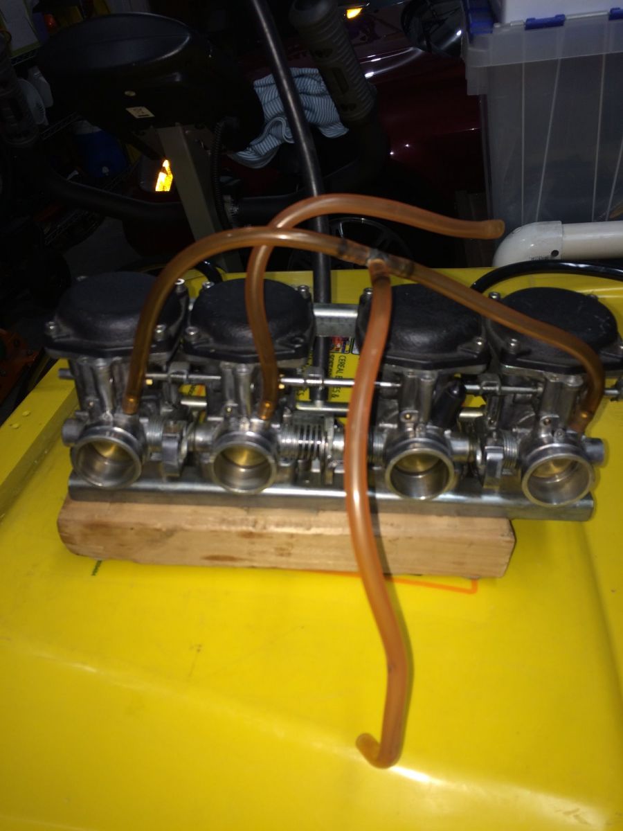 Here is a picture of my carbs with the vacuum lines attached. Carbs 1 and 4 are linked together by a T fitting that attaches to the vacuum switch valve. Carb 2 vacuum line goes to the petcock. Carb 3 vacuum fitting is capped. Any problem with that arrangement? Also, if I get rid of the vacuum switch valve, can I just cap Carbs 1 & 4 as well??