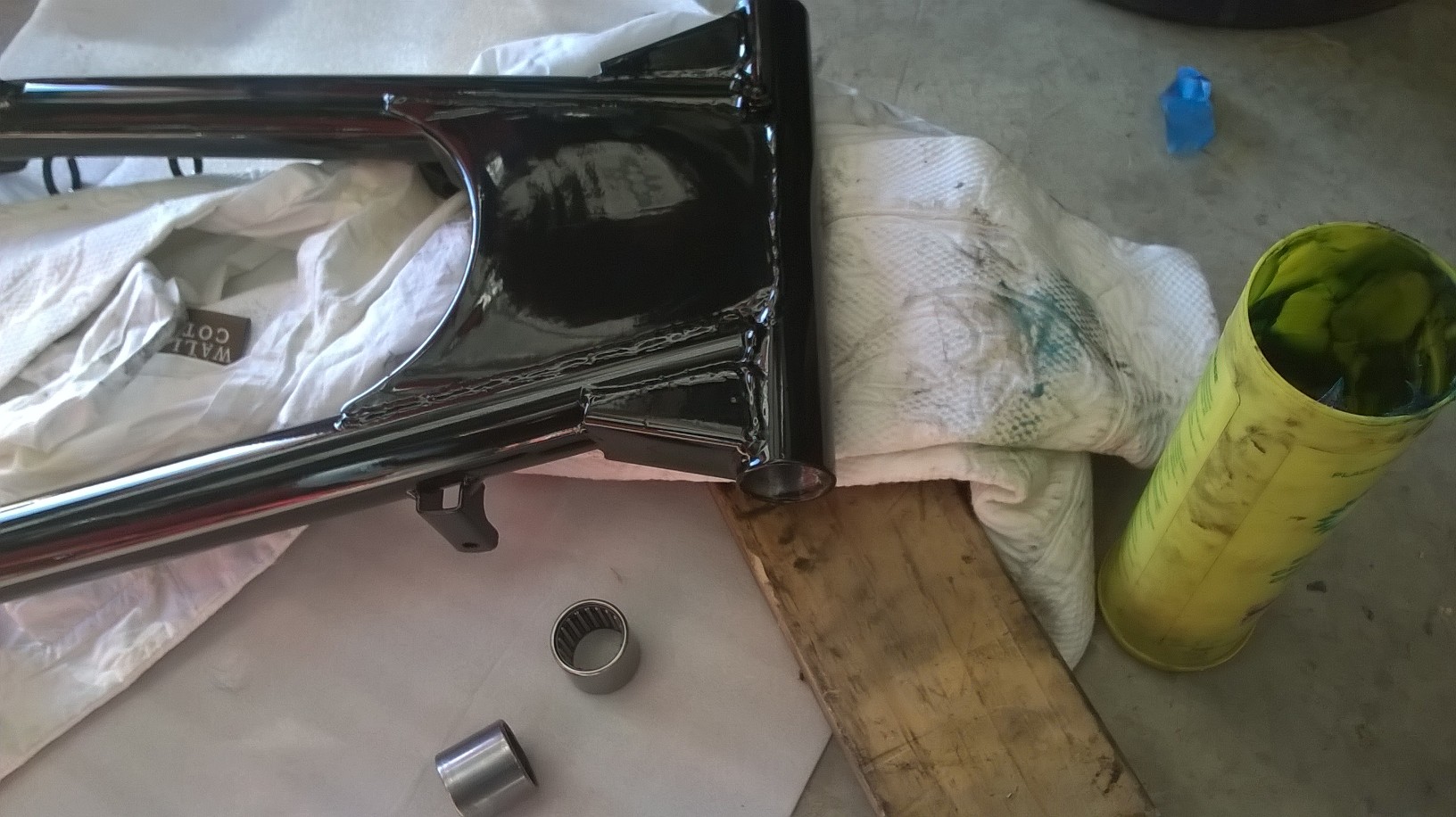Got back to the bike again today and had a list of things to get done. Only got about half way through the list but made some progress at least. Sandblasted a whole a lot of bits that needed painting. Mostly just odds n sods. Put new bearings in the rear swingarm and fitted that up which was cool. Very satisfying getting stuff like this finished.