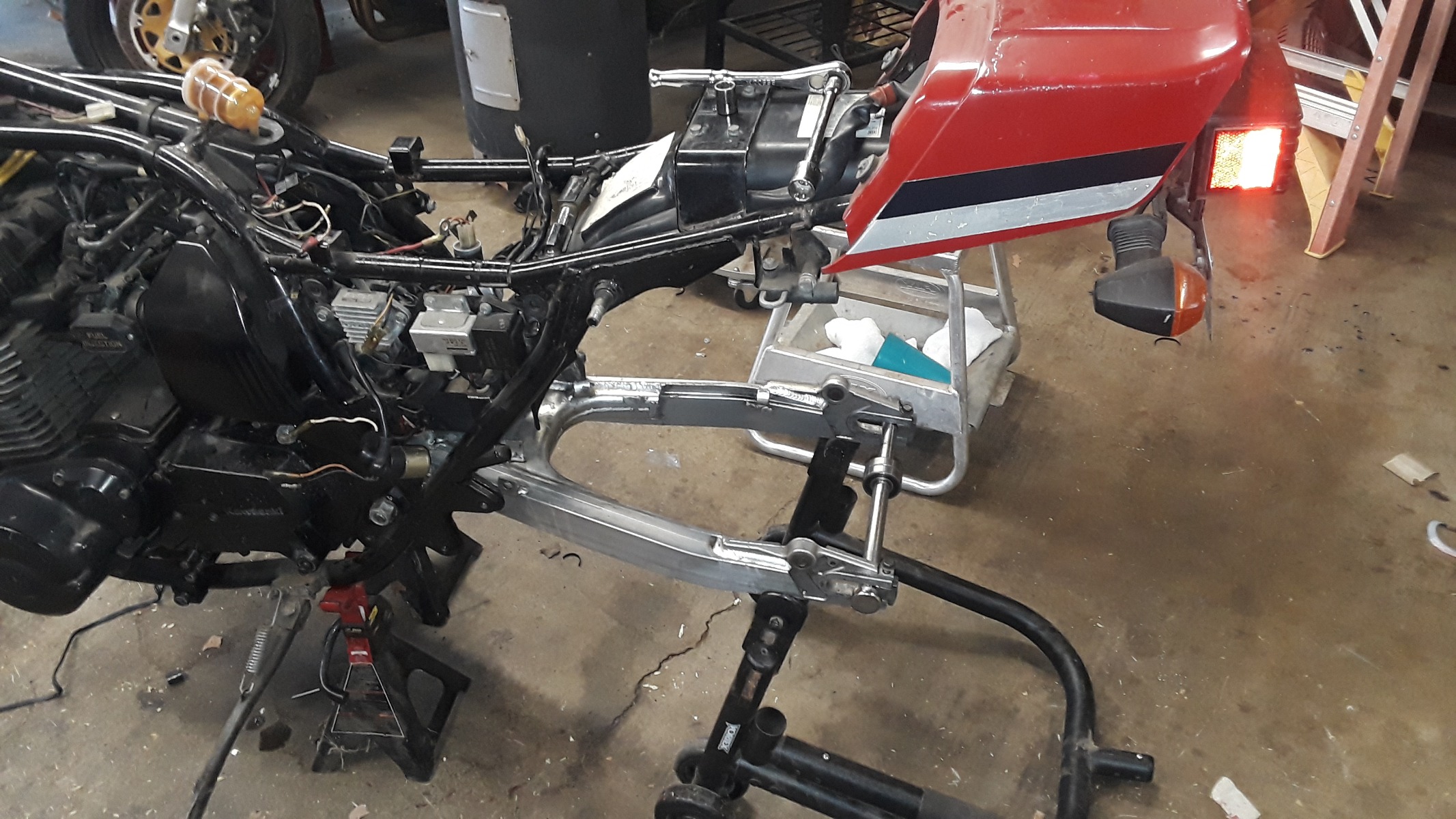 Small update... the Suzuki swingarm is firmly mounted to the GPz for the first time. Wheel bearings have arrived to accommodate the larger Suzuki axle. The wheel has been disassembled and I'm headed to the fabricator's shop Saturday morning to make up spacers for inside & outside the wheel & get the wheel centered in the swingarm.