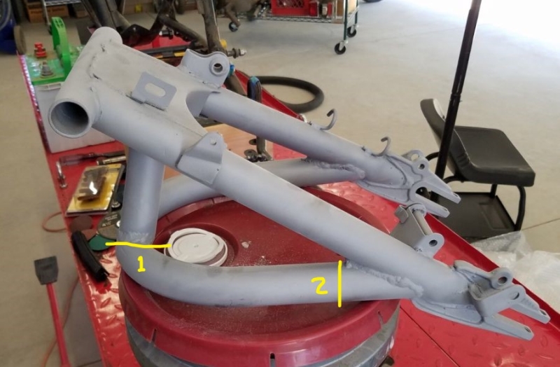 After a lot of thought, here is my plan to modify my mistake on my swing arm. In the picture, cut #1 will go all the way through the tube. Cut #2 will only be part way through, starting on the outside, but leaving the inside edge intact. #2 will be a pie shaped cut. I will bend the tube outward, and insert a short tube section in the gap at cut #1. I am thinking it will be 3/4" to 1" wide. This will move the brace outward, giving the chain the clearance it needs. After welding, it will get ground smooth. Then it will get stripped and re-powder coated. Unfortunately this will cost me four new pivot bearings, as they will not live through the process. I will need to remove the bearings before hand, which will likely ruin them. The goal is to keep the shape of the tube as intact as possible so it doesn't look butchered. It will end up non-symmetrical on the left, but chain clearance is by far more important.