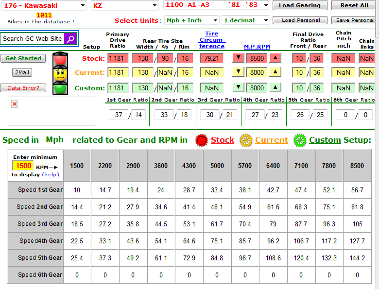 Well I can't do 80 in first, I can in 2nd, and I redline at 8500 and really don't wanna be blowing gaskets or ruining valves at the moment. Here's the results from the stock setup by GearingCommander: