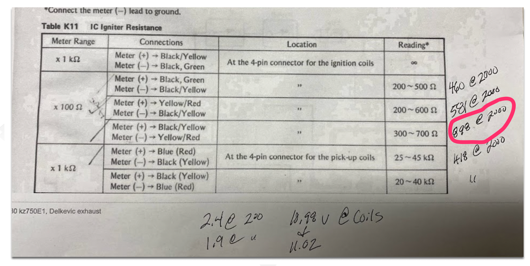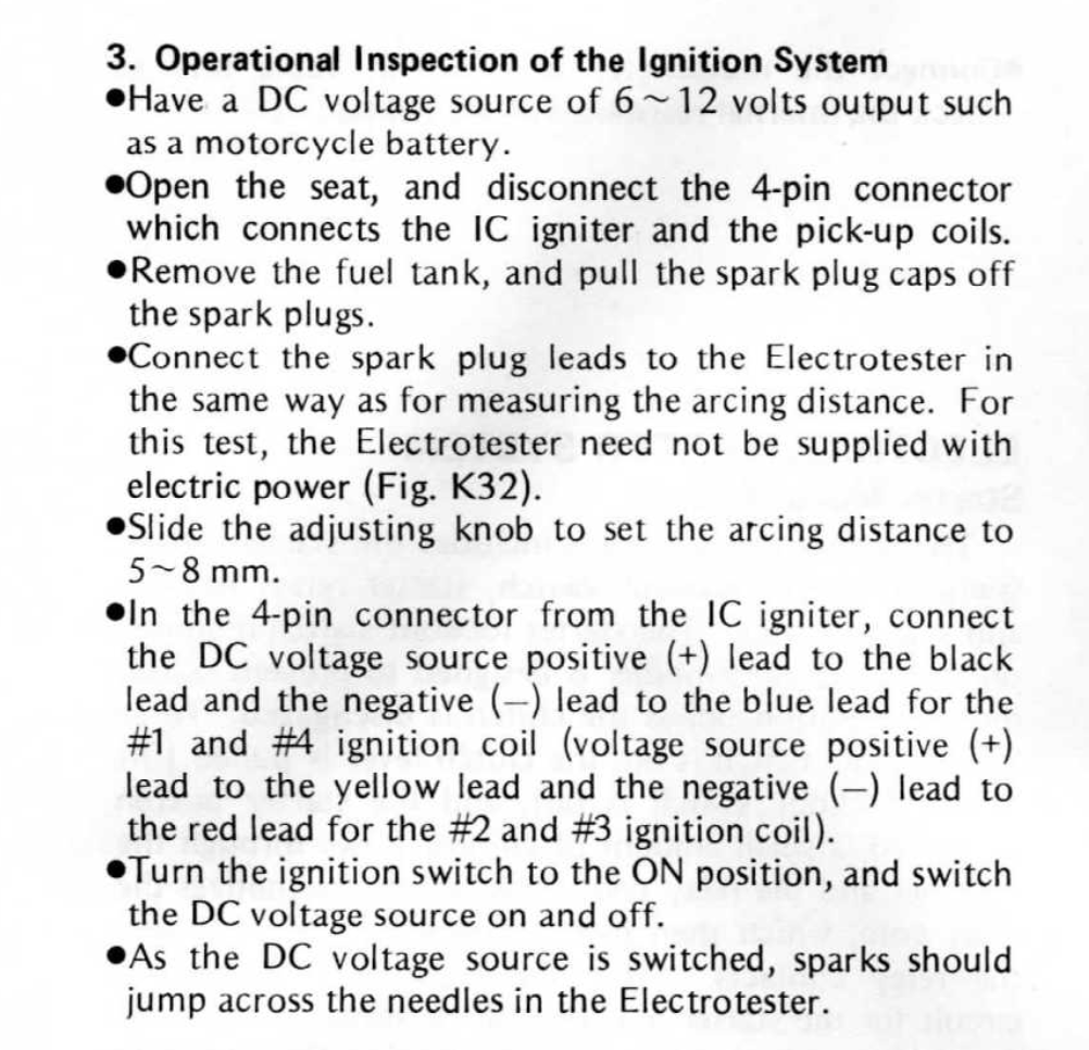 JR, good call on downloading the GPZ750 manual. I found this test procedure and when through it and indeed, I laid eyes on spark on all the plugs. So, this is telling me the issue is with the pickups not sending a signal. I did resistance tests on the pickups and they passed. Is there a way I can force the pickups to fire if I touch a ground wire to the pick up lead should the points fire?