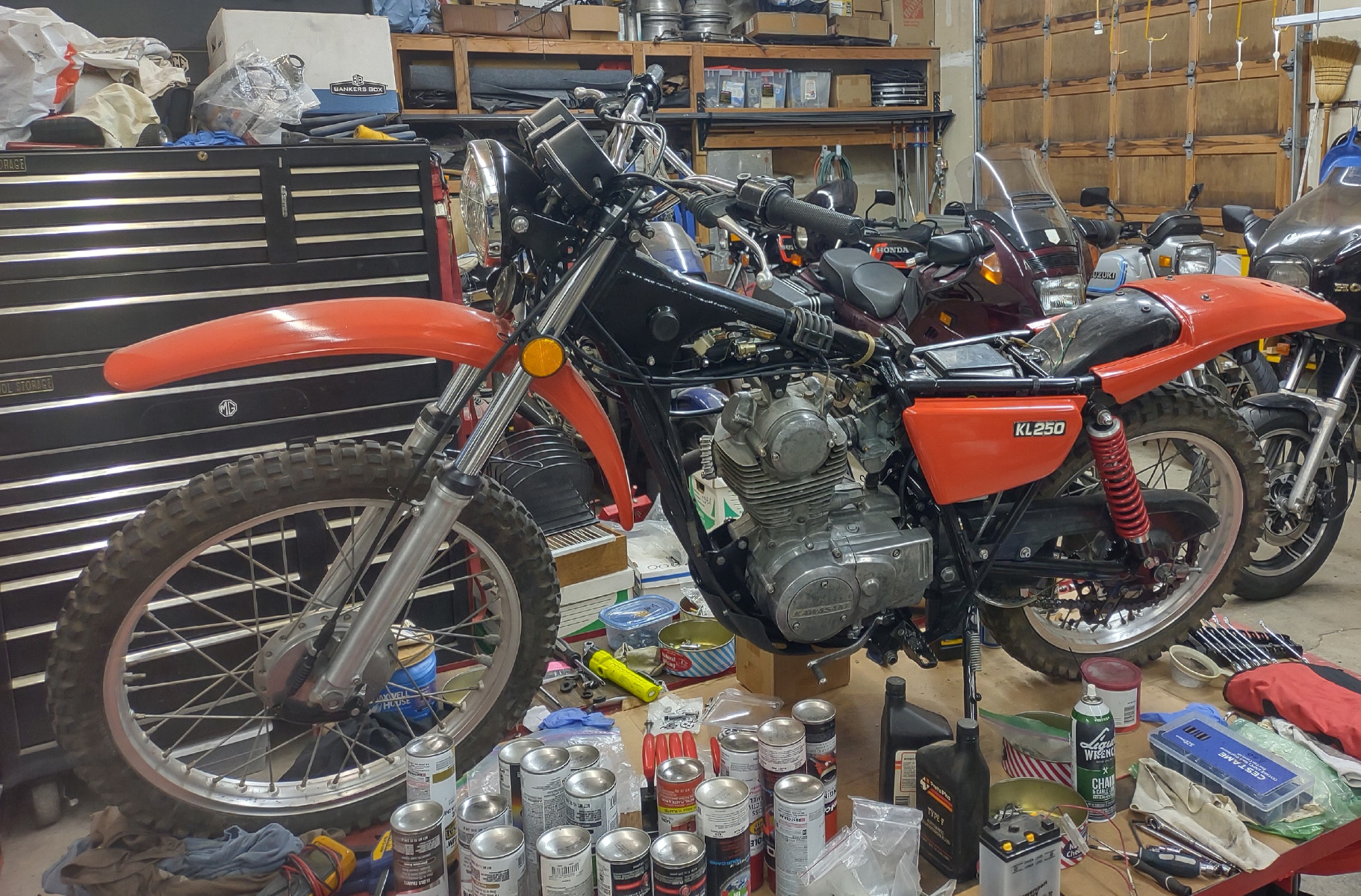 I also have a 78' KL 250 I'm almost done resurrecting for my son. It is almost done. It's got 15k miles on it but was pretty rough. We've got almost everything done but had to cobble up an exhaust system. Only the head pipe was good, the middle is two pieces of CB 900F head pipe and a VF 700S right side muffler. The muffler probably won't last long with a beginning rider. After it dies I'll pick up a small universal muffler.