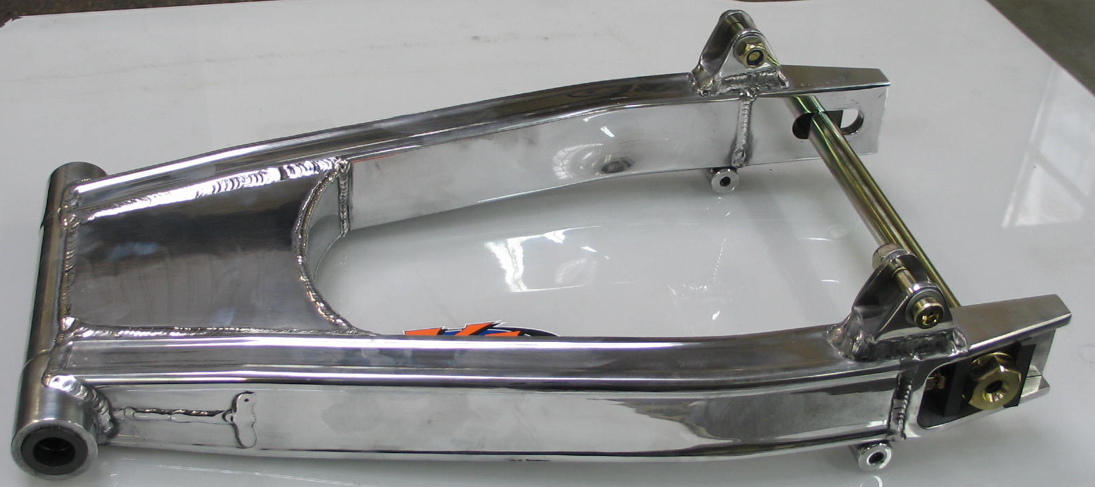 When that didn't work out I I got a 98 KZP swing arm that is 1 1/2" longer and is beefier than stock. Problem was it's wider at the pivot so I had to shave some off each side, cut the spacer to match, install thick washers over the inside pivot bushings for it to clear then clamp down in the inside of the frame. I didn't want to shave the bushings in case I wanted to go back to stock if this didn't work. It works well with no slop and is solid but it presented another problem. THE TIRE HITS THE FENDER ON LARGE BUMPS! I made a fender extender to move it 2" back so that worked.