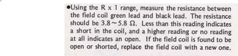 04 Mar 2025 04:30It should have continuity between the black and green wires of the field coil with the wires disconnected from the RR (check manual for resistance spec) if there is continuity between the green wire and ground (with the black wire disconnected) then it is faultyI have just put a meter on the green wire and there is conductivity to earth its not a dead short its about 4 ohm's, I suppose that means thas toast as well