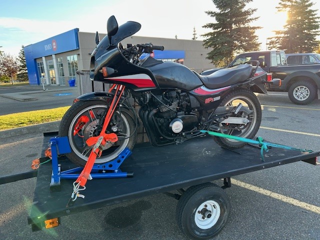 A bit intimidating coming on a forum knowing so little about bikes with all the knowledgeable people here. However, I am super excited for this GPZ I picked up in the fall. It's not the nicest, but it's pretty nice compared to my old 82 GPZ 550 that I rode for years before someone kicked it over on the street and basically killed. Anyway, here is Riley's dumb adventures for anyone that wants to read and I hope I don't get too many, "you're an idiot" comments. Typical story of me having an 82' GPZ from around 1998 until 2012, then marriage, kids, blah, blah, blah. Just very happy to get a bike again. I bought it out of province as can been seen in the photos, the trailer that I brought it home on. Finally had the inspection done and it failed on tires (which I knew about as the old ones are weather cracked) and the flasher doesn't work. Signal lights turn on, but it won't flash. However, I do have one issue that developed since bringing it home. That trailer was waaaaaaaay too rough and I am not pleased about that but that was only the start of things where I should have known better last Fall. As I was planning on waiting until Spring to get the bike inspected, I turned the fuel to 'Off" or what I thought was off because the petcock is rusted just enough to not really be able to tell what it says. Later that day, there is fuel leaking on the trailer around where the center stand would mount. Doing some reading, I found it's vacuum operated, so I actually turned it to prime. Damn it. I put it back to on, unloaded the bike from the trailer and rolled it by where I am going to store it. About a week later, I figure I will start it, just to hear it run again since buying it, get the battery charger as the old battery is dead. It spins over for a couple seconds and quits. I get the charger reset and crank the engine. After a couple rotations (or so it seems like a couple) fuel spits out between the head and the block....Obviously I stopped cranking it. I removed the fuel tank and took all the spark plugs out. Cranking it again, fuel spits out the spark plug hole and I feel like the worlds largest moron for not having taken the plugs out first knowing it was leaking fuel. Anyway, it's October. I empty the fuel tank and fuel bowls and put the bike in storage until I am ready to deal with it in Spring (lines for fuel plugged and tank in the garage inside a tote with moisture absorbent gel).