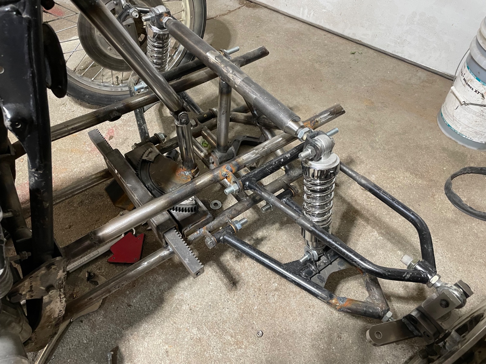 That is an interesting looking machine! Is that a prefab front end or one of you own design. I kind of like the smaller front wheels but what do I know? I would like to watch, from a far so to speak, just what you do with this project.