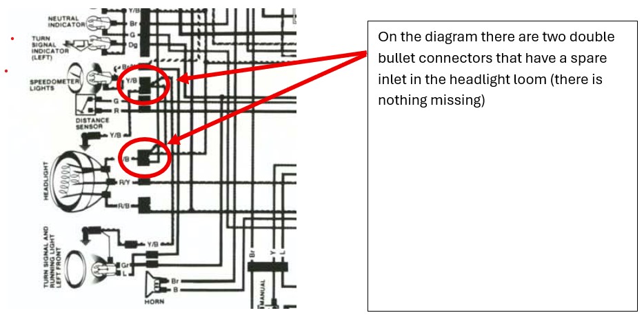 Right now I'm now concerned about that missing ground wire. It grounds something so that thing may not be working properly. I may be wrong but it really appears to be grounding the front turn signals and maybe the headlight, but I am not very good at reading these diagrams 😅. Is there a rudimentary option to fix this or should I leave it be?