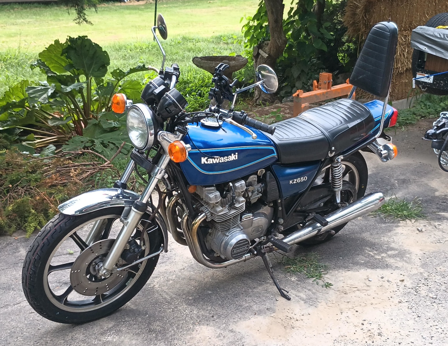 1978 KZ650 C2, 130K kms, Delkevic ex, EI, CVK32, PMC easy clutch, ATK fork brace, steering damper, braced swingarm, ZRX shocks, 18" Z1R front wheel.