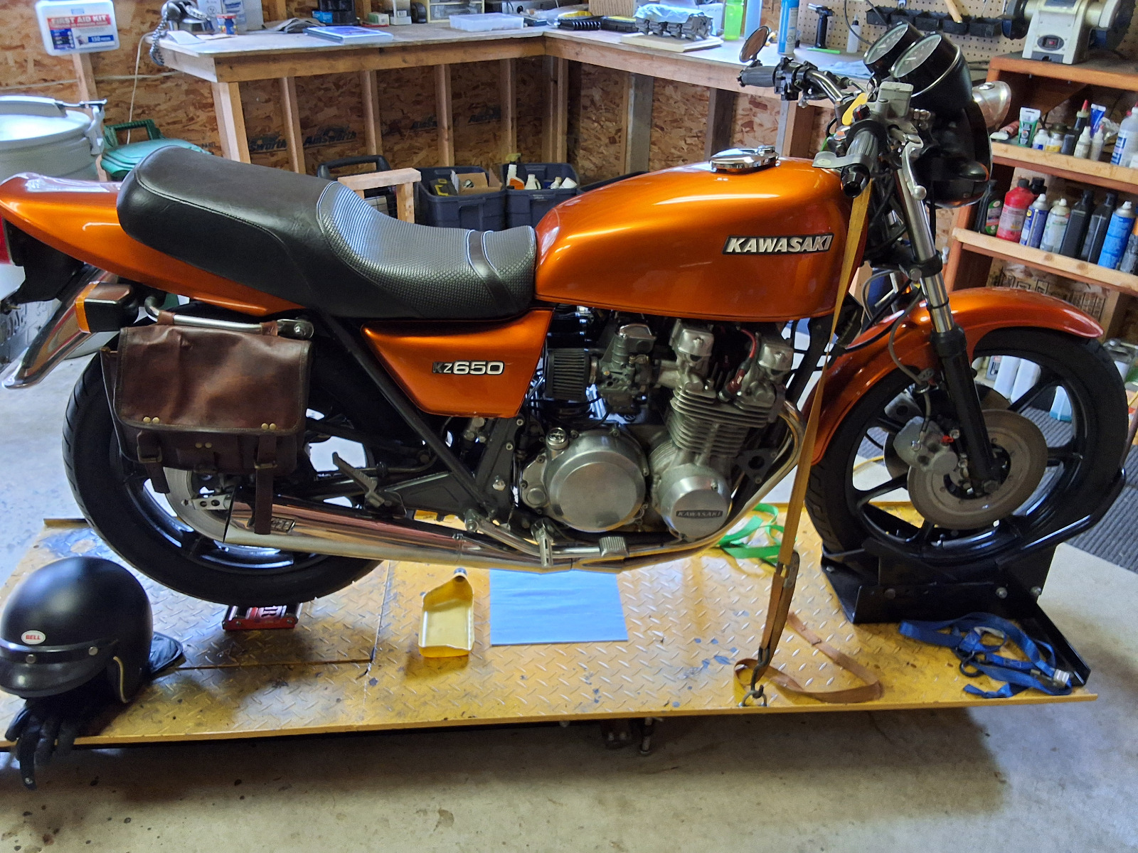 My KZ650 has the GPZ750 oil cooler and oil pan along with 26 mm Mikuni smoothbore carbs, K&N pods and Vance and Hines 4 into one. Inside my KZ650 it has a Ninja 600 6 speed transmission with the Dyna coils and ignition. I'm having trouble dialing in the carbs but I'm getting close 117.5 mains, 15 pilots and the jet needles are in the 3rd position. The carbs are backfiring. I'm guessing its a lean miss. I plan to check the float hight and dropping the needle jets to the 2 position. Any sugestions would be appreciated. Thanks to everyone