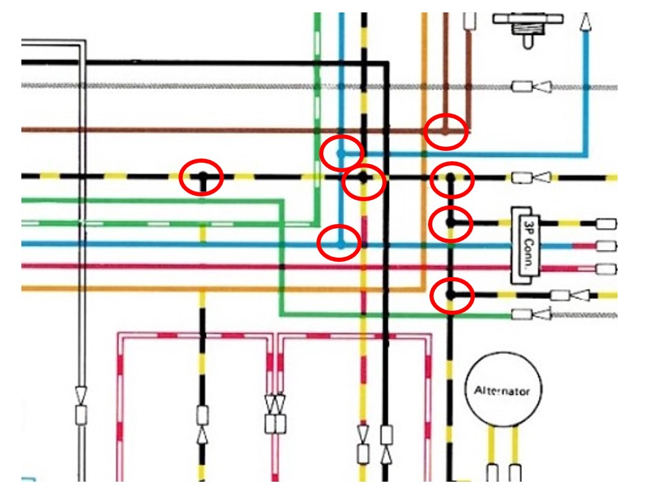 I found out that there are thirteen wire splices...all crimped none of them soldered, with different wire colors being spiced into various other wire colors. - you will find many more. Every car and bike manufactured has dozens of these "node" connections (crimped splices) throughout the loom. This is how the factory build them to reduce production costs and to avoid having a loom "as thick as a baby's arm". I have attached a diagram to demonstrate how these are shown on the diagram (the red circles)