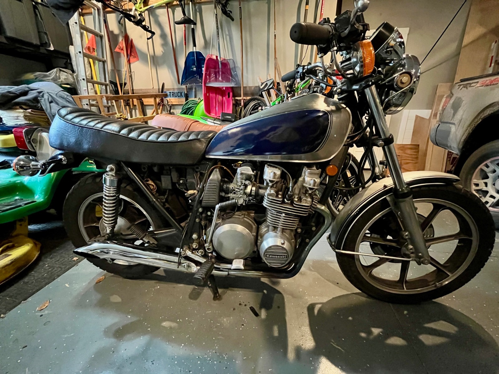 1978 KZ650 C2, 130K kms, Delkevic ex, EI, CVK32, PMC easy clutch, ATK fork brace, steering damper, braced swingarm, ZRX shocks, 18" Z1R front wheel.