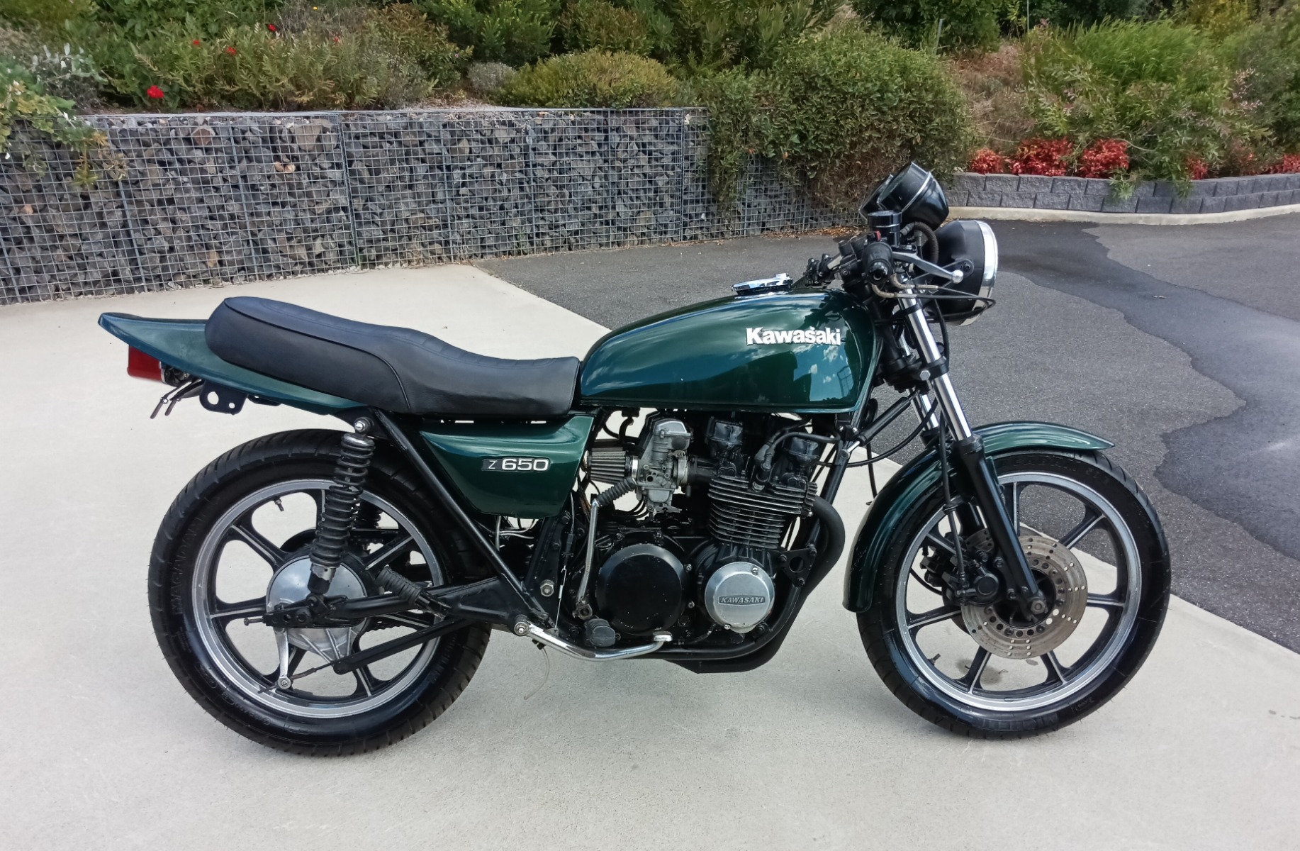 1978 KZ650 C2, 130K kms, Delkevic ex, EI, CVK32, PMC easy clutch, ATK fork brace, steering damper, braced swingarm, ZRX shocks, 18" Z1R front wheel.