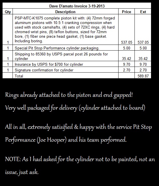 Pit Stop Performance: $580 Complete 1075cc MTC piston/ring kit, gaskets, wrist pins & teflon buttons... And this includes boring of the cylinder!!!! You just can't beat the price all....