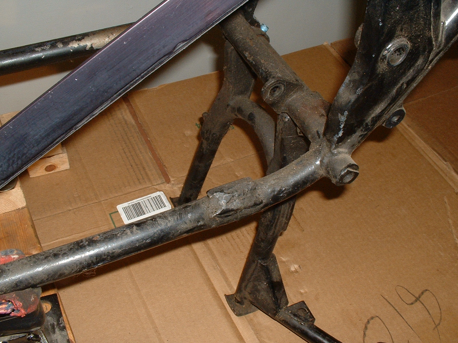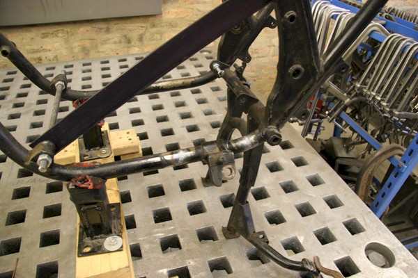 As you can see in the photo, I shaved all of the tabs (some were mangled anyway). You can also see how the subframe was hack-welded on. It's a crappy mig job. I don't know who welded it. Bottom line is, the sub-frame is all out of whack. I used some pipe clamps and 2X4's to get it straightened. Most of the critical areas (swingarm to steering axis) are now straight. It's going to take some trickery to get the tail and subframe to "look" straight. The shock mounts are a little off, but there's no fixing that without major work. I'll see if it affects the handling before I undertake that job.