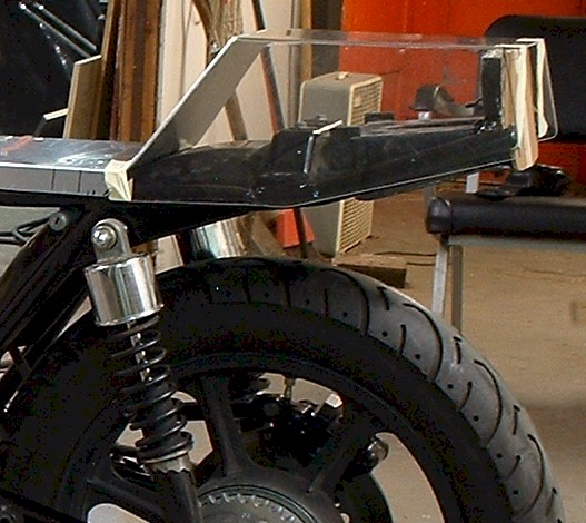 Next was the seat pan. It's 1/8" aluminum bent by hand on wooden forms. The rear bend was done without anything special, but the side edges were tougher. The trick on the side bends is on the underside. Before I bent it, I took a 1/4" thick grinding wheel and cut a groove along the bend line on the underside. I cut about 1/32" deep. This forced the bend to be straight, and it also controlled the bend nicely so there are actually 2 bends right next to each other if you look very carefully in person. This gave a very nice machine-bent look to it.