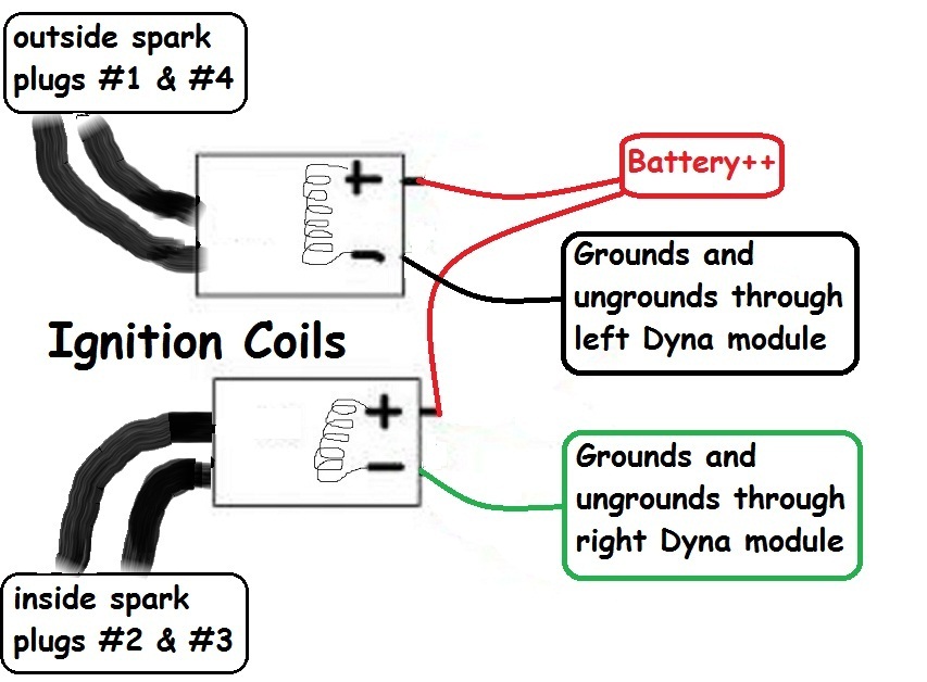 everything that is supposed to wrk with the key on works, the coils are wired with Hot on one terminal then a jump wire to the second coil (per Dyna instructions).