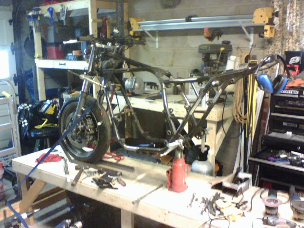 I am also hoping to come up with something clever for a hanger. I am thinking about using a couple of pieces of steel rod with a collar around the shock mount and maybe add a tab under the tail section to attach them. Kind of a triangular arrangement, with round material to blend with the roundness of the bike.