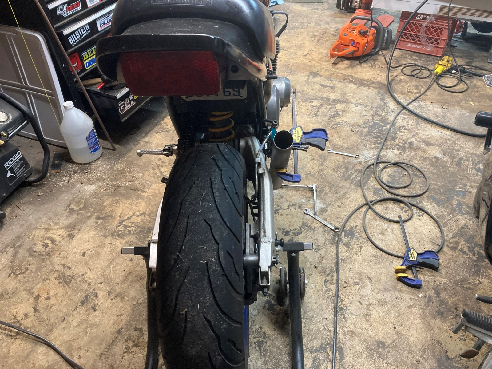 Well as expected the longer swingarm made the bike not want to turn at all. I converted back to the stock length swingarm. Also dug into the carbs to see if I could remedy the part throttle cruising issue I faced on the way home from work. I thought the pilots were going to be stock 37.5 Mikunis and they were just too lean at that throttle setting... nope, someone had 45s in there and I was seeing the result of a fat pilot instead. I wonder if the larger ones were used on larger displacement (GPz1100) motors? Anyway, I had already ordered the 40 pilot jets that I have seen suggested to be paired with the DJ stage three that I have been running for years, I just need the time for a test ride soon...