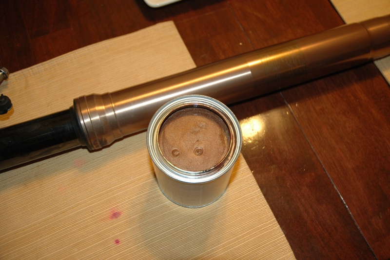 I stopped by the paint supply store with one of my fork legs and told the counter guy "I want some paint to match this color". After 10 minutes of solid arguing with the guy (he refused to help me, and kept telling me he couldn't match the color. Despite my assurance that it only needed to be close) a woman that worked there walked up with some color panels for me to browse. I was able to find a suitable match, and I really hope it will look good on the bike with the silver engine and everything else predominately black.