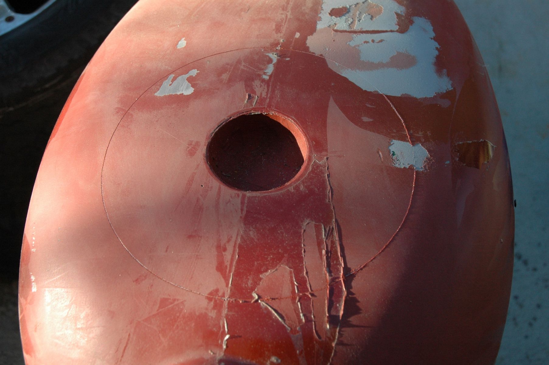 In between working on some carbon fiber molds, I drug out my stock tank and started chopping it up. First I made a template identical to the O.D. of the cut out for the ZX fuel filler, and traced it on the tank: