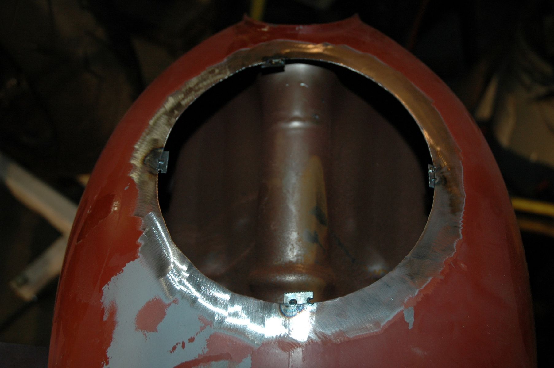 After that I tacked in 4 tabs to support the ZX fuel filler sheet metal so that it would mate up flush with the stock tank: