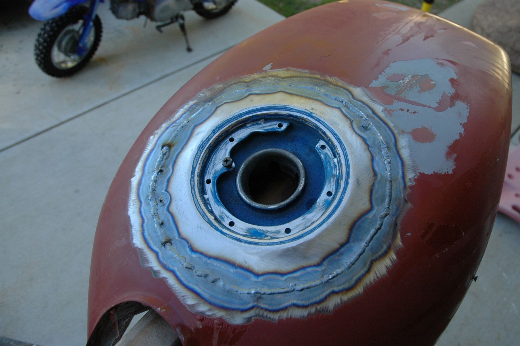On that note, if I had to do it over again, I would have welded in 8 tabs instead of 4, and I would have tack welded in between every tab first, then at the tabs before doing any stitch welds to help prevent the ZX fillers sheetmetal from warping. It's a thinner gauge than the KZ tank, and it doesn't stay put as well. So I spent time last night tacking welding rod into spots to act as pullers to get the filler back into alignment with the stock tank. It was time consuming, but because I didn't have as many support tabs as I needed, and I didn't spot weld in more spots before running some short beads, it was the price I paid. Live and learn!