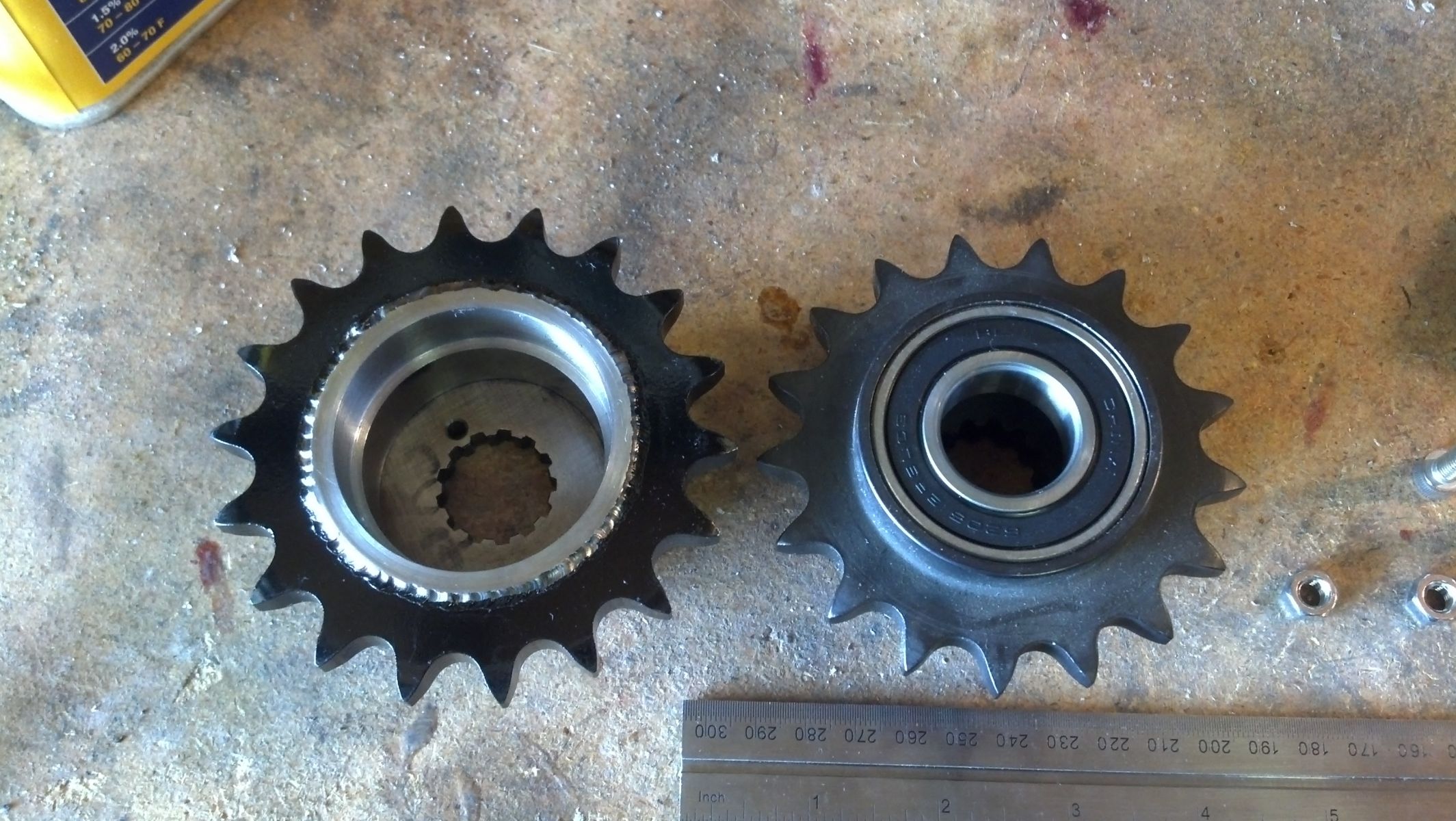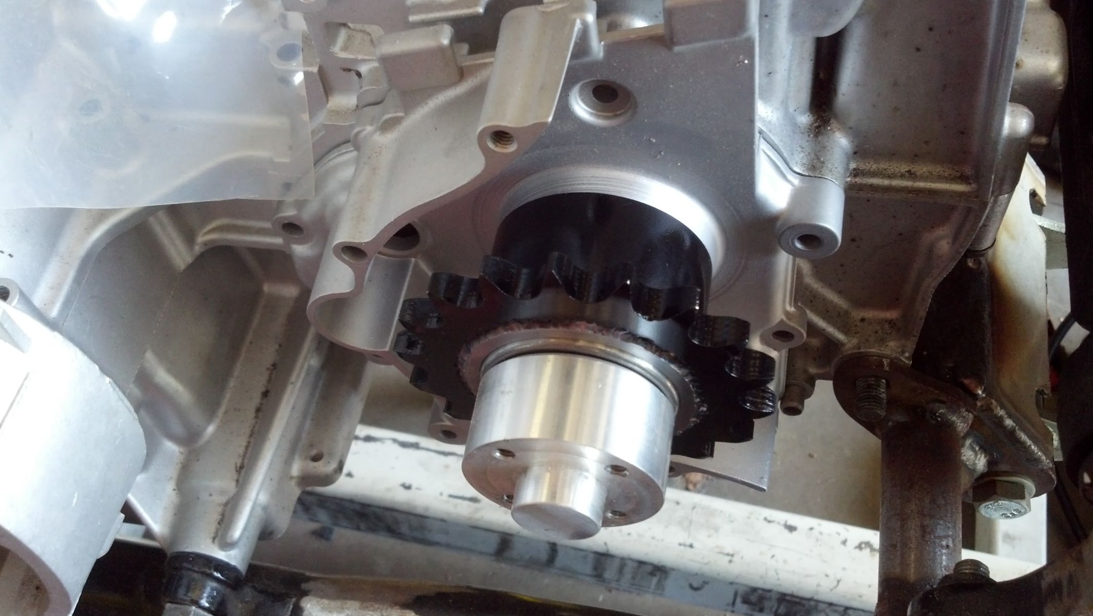 Interestingly enough, the new D&G sprocket mounts the bearing support plate a tiny bit closer to the engine than the PMFR part. I know Doug was trying to keep it close to aid in making the clutch parts work, and keep it close he did. Sitting on the output shaft with the bearing support spud in: