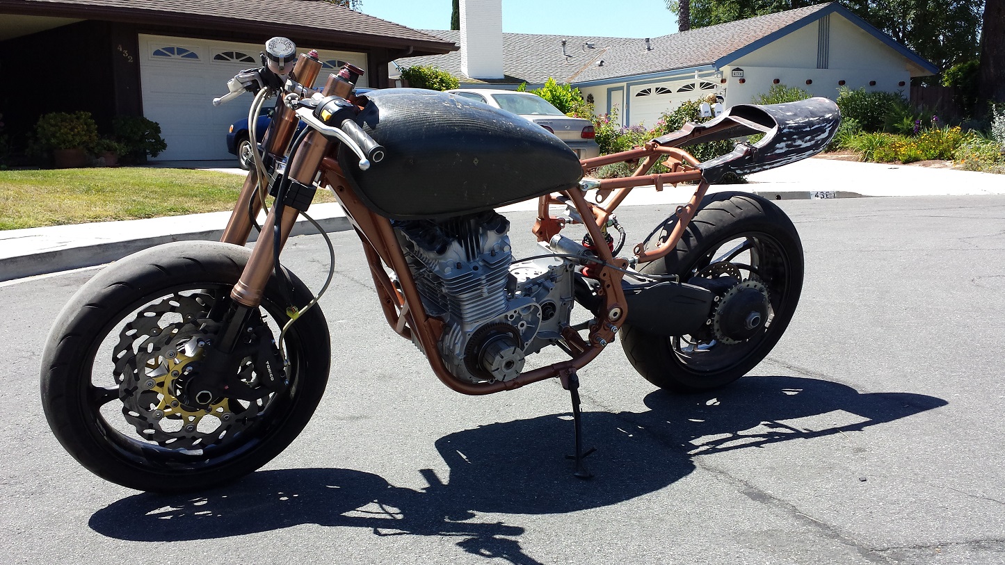 Very nice ,at first i thought the copper was a little odd. With it assembled it realy looks great. blends with the forks well also looks bad ass with the swing arm (nice work) , whats the size of the engine?
