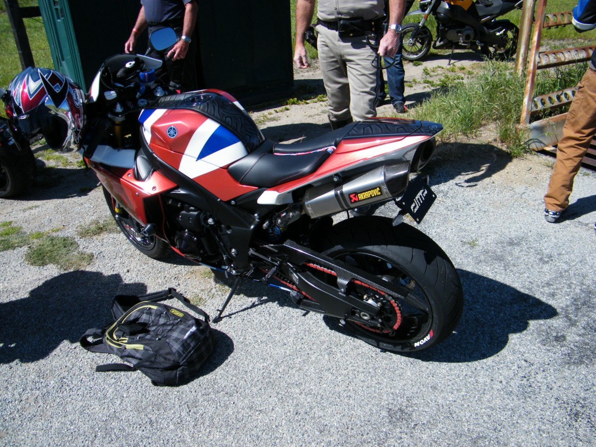 we go out onto the track...i catch up to a RC30 which has caught the pace car....i settle in for my first lap and go through turns for the first time having told amy to take a video on the third lap when i know where the road goes...heading for turn 11 i am happy, and gonna try tossing the bike this next lap...just me and an RC30 behind the car and moving along at a good clip...leaning....then....when out in the road i see a cop on his bike parked sideways before the tunr to go into the straight and shift through the gears... bike pointing us into pit lane...he is blocking the track and pointing to go in