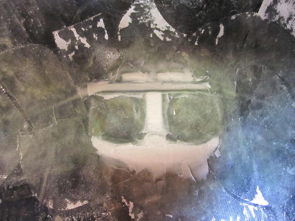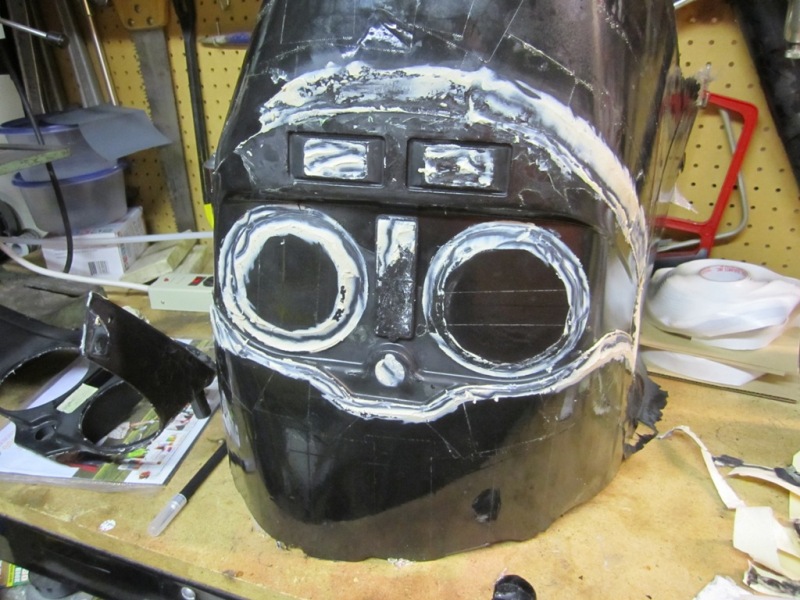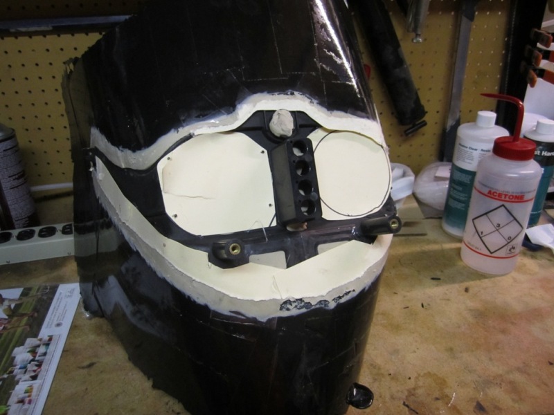 The heavier weight fiberglass cloth doesn't like to conform to the tighter radiuscorners/edges' of the mold. So with a healthy layer of lighter weight cloth, I mixed some fast resin with high density filler to make a thick paste. I used a cut down body filler spreader to fillet the corners. It doesn't look pretty, but it doesn't have to. Once I lay some glass over it and saturate it with resin, it'll smooth out.