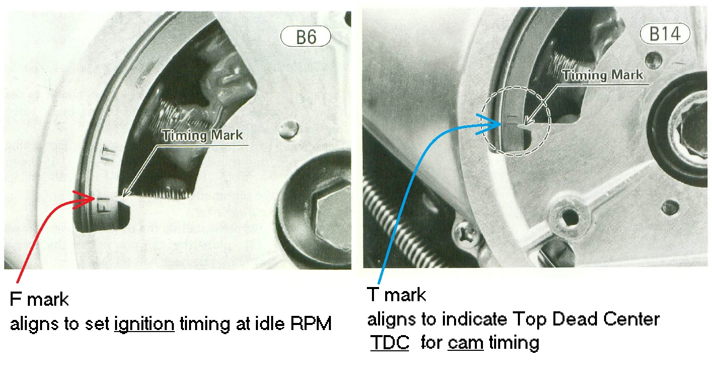 To confuse things more, I'm also reading elsewhere TDC is the position where both valves are closed. This suggests to me that the timing mark should be aligning with the T when the valve is at the very bottom of its movement?